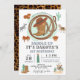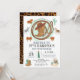 A "saddle up" cute and whimsical wild west cowboy first birthday invitation in terracotta browns and blues for a boy, with western cowboy gear and ranch animals. Saddle, steer, horses, cactus, and lasso. Everything a cowboy needs. It's his first rodeo! The back of the invite has a cracked faux leather background.