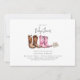 Shoe themed baby shower featuring illustration of pair of grey baby booties with a pair of brown cowboy boots and a pair of pink cowgirl boots.