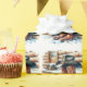 Christmas gift wrap depicting a watercolor illustration of cowboy boots and a cowboy hat on the front steps of a log cabin on a snowy winter day.
