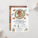 A "saddle up" cute and whimsical wild west cowboy first birthday invitation in terracotta browns and blues for a boy, with western gear cowboy gear and ranch animals. Saddle, steer, horses, cactus, saddle and lasso. Everything as cowboy needs. It's his first rodeo! You may customise this for any age.