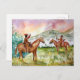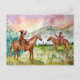 a traditional watercolor landscape painting featuring a cowboy on the horse greeting a distant native american on his horse in a natural landscape.