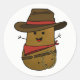 An adorable happy brown potato dressed in a cowboy hat, a red bandanna and a lasso on his belt.