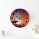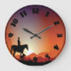 This design is a cowboy riding a horse. The cowboy on the horse is heading across the land at sunset. This cowboy riding a horse design looks great on this Clock