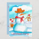 A fun festive party invitation for the Christmas holiday season featuring a snowman wearing a cowboy hat and red scarf with red ornaments and a horseshoe on his branches illustrated with watercolor.