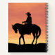 A cowboy rides his horse, silhouetted against a bright sunset sky, on this beautiful spiral notebook for a western horse enthusiast.