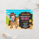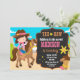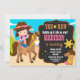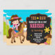 This Brown and pink Country theme invitation features girl riding a horse sheriff badge and a cowboy boots.