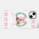Personalised iphone case with cowgirl boots and a big pink bow framed with a laurel wreath and name banner. Add your name, monogram or initial. Girly design with borders of pink bows to match the cowgirl logo. Designed for the iPhone 14 Plus but will fit many other models. If you choose a different model check the design still looks great in the preview and tweak if necessary (click "edit using design tool").