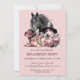 Halloween design in girly colours - soft pink and dark grey, black - of a black horse, a girl in witch hat who also has her cowboy boots and hat there, candles, pumpkins and flowers.