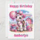 An adorable cowgirl pony is celebrating her first birthday with a pink balloon with the number 1 and a pink cowgirl hat on a farm. Personalise the card with your child's name.