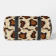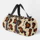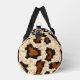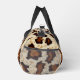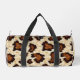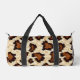 This cut and sew small size duffel bag is shown in a rustic cowhide print with black straps.