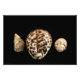 A still life photograph of three spotted seashells lined up, with the largest one in the middle, on a black background.