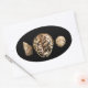 A still life photograph of three spotted seashells lined up, with the largest one in the middle, on a black background.