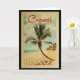 A uniquely retro mid-century modern Cozumel Mexico art print in vintage travel poster style. It features a curved palm tree on sandy beach with ocean under a blue cloudy sky.