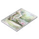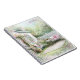 This notebook cover features a serene garden retreat beside a charming white cottage with arched windows and a green shingled roof. A tiled patio hosts elegant wrought iron furniture with soft pink cushions, inviting quiet moments with a teacup and book. Surrounding the scene, lush blooms in shades of pink, white, and green spill over flower boxes and beds, framed by a classic white picket fence. A bird in flight adds a gentle sense of motion to the tranquil setting, making this cover perfect for capturing thoughts, dreams, or reflections in a peaceful, nature-inspired space. Personalize with your own name.