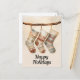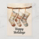 This cozy flat holiday card features an illustration of three rustic Christmas stockings hanging on a natural branch. The stockings showcase lovely boho and folk art patterns in warm, muted colors like terracotta, dusty blue, and cream. The simple "Happy Holidays" greeting underneath captures the warm, welcoming feeling of the season. This design is perfect for sending stylish holiday wishes with a touch of hygge, rustic charm, and patterned elegance.