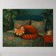 Bring a sense of warmth and quiet charm into your space with this cozy red panda wall art. The illustration features a peacefully sleeping red panda curled up on a richly patterned floral bed, surrounded by lush green houseplants and soft, ambient lighting. The gentle color palette—deep greens, warm oranges, and muted floral tones—creates a calming atmosphere that feels both inviting and nostalgic.