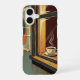 A warm-toned illustration of a cafe's cozy atmosphere, depicted as seen through a vintage window pane.