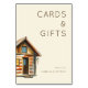 This wedding tabletop sign features a charming, rustic cabin illustration on the left, rendered in warm earthy tones of brown and orange with a watercolor-like texture. The right side showcases elegant serif typography that reads "CARDS & GIFTS" above a heartfelt "thank you," creating a balanced and inviting layout. The design exudes a cozy, whimsical theme perfect for expressing gratitude at your special event, capturing both the warmth of home and the elegance of a heartfelt thank-you message.