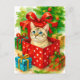 A sweet watercolor illustration of a blue-eyed cat peeking out of a Christmas gift box, surrounded by festive presents.