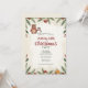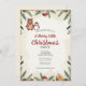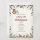 Warm and inviting Christmas party invitation with charming woodland creatures – a friendly bear and a cute penguin wearing festive scarves – nestled among pine branches, holly, and decorative red ornaments. The soft beige background and scattered natural elements create a cozy, cabin-style aesthetic perfect for intimate holiday gatherings and rustic celebrations.