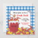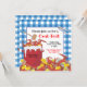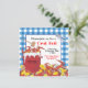 Super fun Crab Boil party invitation. Hot bubbling red pot of crab with corn on the cob, potatoes and lemons, mallet and crab utensil sit on a newspaper with a blue chequered tablecloth patterned background. Hand drawn illustration by McBooboo.
