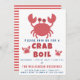 NewParkLane - Summer Crab boil Party Invitation, with a cute hand drawn red blue crab cartoon. A fun theme for a summer party or your 4th of july celebration with friends and family! On the backside a fun nautical red striped pattern.
