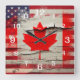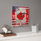 Square wall clock for a Canadian American featuring a print of the American flag fused with the Canadian flag on rustic wood with paint peeling off.