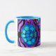 This powerful, striking looking mug features an original digital painting of highly stylised chrysanthemums & tulips in vibrant, cool shades of violet & electric blue. The style was inspired by the late mid-to-late 19th century "Arts and Crafts Movement" which sought to celebrate the individual skilled craftsman as a protest against mass-production & industrialisation.