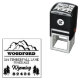 Rustic retro return address rubber stamp with retro fonts, craggy mountains, and spruces.