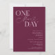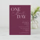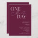 Minimalist wedding rehearsal dinner invitation featuring typography text that says "one more day." The background is cranberry.