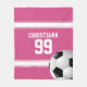 Perfect for the soccer fan or soccer player whose team colours are pink and white, with a soccer jersey style design in pink with white stripes and customisable text for their name and number. A soccer ball is also featured as part of the design. A fun, sporty and girly soccer gift.