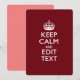 Your personalised Keep Calm saying on a fine custom burgundy accent colour style decor. A personalised Keep Calm style saying on a one of a kind gift. Humourous or whimsical try on your creative words on two editable lines of text. Remember to use CAPITAL letters for best results.