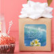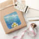 Waves return address square sticker to use as an envelope seal.  Blue ocean waves are breaking in the background.  White text is added in two places- in script for the name and printed for the address - up to three address lines can be added.  White frangipani, or plumeria, flowers at the bottom.  Shown on the larger 3 inch stickers for easy to view.