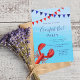 An elegant invitation for a nautical coastal by the sea summer party, beach party or seafood party. Blue sea water as background and a large red lobster and black and red flags as decoration. Templates for your party details, information.