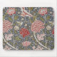 A mouse pad with the floral textile by William Morris (1834-1896), Cray (c. 1883). A floral pattern of pink and red flowers on a dark grey background.
