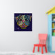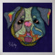 Unique crazy Bulldog dog face with bold, colourful abstract patterns on a blue background. Popular with dog lovers and pet lovers and rescue dog lovers.