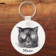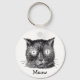 This key chain sports a vintage image of a black and white cat with clocks for eyes. Reads Meow or change to the name or words of your choice.