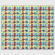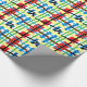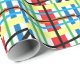 This cheerful, whimsical wrapping paper displays a colourful abstract pattern of crisscross lines and stripes in red, orange, green, yellow, blue and black.