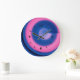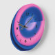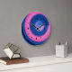Its an abstract "all seeing eye" that is a Crazy Neon Pink and Blue Swirl Round Clock for a bright decorative accent on any wall in the home. It is a flat surface, but this wall clock does look like a neon ball shape. It has a 3D art quality.