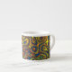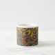 A cool Espresso Mug, with an abstract pattern of crazy swirls in shades of dark, blue, dark green and brown with golden yellow highlights.