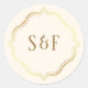 Elegant monogram stickers with faux gold foil ornate and cream background.