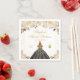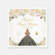 This elegant and glamourous sweet sixteen napkin features a beautiful princess with blonde hair and fair skin in a black ball gown. The text combines handwritten script and modern sans serif fonts for a classy and sophisticated look. The floral arrangements, butterflies and gold confetti create the perfect blend of rustic and chic.