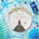 This elegant and glamourous sweet sixteen plate features a beautiful princess with brown red hair and fair skin in a black ball gown. The text combines handwritten script and modern sans serif fonts for a classy and sophisticated look. The floral arrangements, butterflies and gold confetti create the perfect blend of rustic and chic.