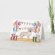 Destei's original cartoon illustration of an English cream colour Labrador Retriever breed dog standing among some pastel colour birthday balloons, gifts and a bunting banner. The pastel colours include pink, green, blue, red, orange and purple. The dog is standing on a yellow wood floor texture and the background has a playful pastel colour polka dot pattern. On the inside of the card there is also a personalizable text area for a custom message.