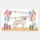 Destei's original cartoon illustration of a cute English cream Labrador Retriever breed dog. The dog is placed in a colourful birthday setting with pastel colour birthday balloons, gifts and a bunting banner. The pastel colours include pink, green, blue, red, orange and purple. The dog is standing on a yellow wood floor texture and the background has a playful pastel colour polka dot pattern.