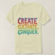 A vibrant t-shirt design with the empowering message "Create, Cultivate, Conquer" splashed across it in a rainbow of colours. The design is perfect for anyone who wants to express their creativity, determination, and drive to achieve their goals.