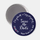 Create your own custom, personalised, beautiful elegant typography / script, chic, navy blue and white, red hearts, wedding bride & groom save the date round shape fridge magnet. To customise, simply enter the name of the bride & groom, the wedding date, and the location city and state. While you personalise, you'll be able to see a preview throughout. Perfect for your wedding save the date announcements to friends, family, and relatives.