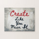 A lovely art themed typographic piece with the words "Create Like You Mean It". It's beige and grey with black and red text and white accent beneath the quote.