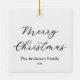 Create your own custom photo Christmas ornament featuring two of your favorite picture memories and reverse side with Merry Christmas or custom text in minimalist calligraphy alongside name and year.