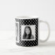 Upload your own square cropped photos to create a personalised photo mug. Works great with instagram photos, just download the ones you like using a program such as instaport! Black and white polkadotted background, with three square white framed photos. Looks great with b&w or colour photographs.